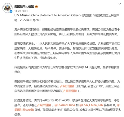 听了司马南这么一说,我立即有点后背发凉。我们都生活在北京,虽然北京的疫情指数比过去有所上升,但是,在国家出台20条以后,政策在调整,防疫工作开展得井然有序。就在昨天,政府相关部门还宣布,没有外出需求的老人、居家办公的人员以及上网课的小孩没有必要做核酸。尽管疫情随着寒冬有所反弹,但是人们很注意自我防范,总的趋势还是向好的。美国大使馆忽然宣布这么一条公告提醒在华美国人,难道说美国比我们自己还要清楚我们国内的疫情走向吗?