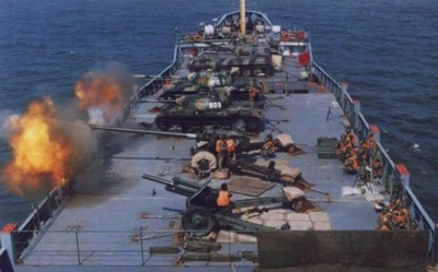 彼时的中国,较为先进的装备仅有百余架俄制苏-27、苏-30战斗机,火力不足的海军为了掩护登陆部队,甚至要把地炮搬到民用船只甲板上来。