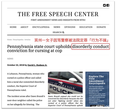 2018年宾州一名女性因为「骂警察」被判「行为不端」;