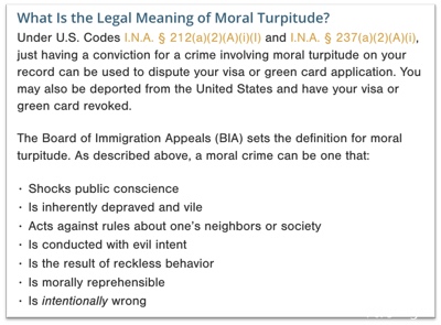 除此之外美国还有一类所谓「涉及道德败坏的犯罪」(Crimes Involving Moral Turpitude),其描述更加含糊不清,包括「颠覆公众良知的、本质上是堕落和卑鄙的、违反街坊邻里规矩的、居心叵测的、处事莽撞的、故意使坏的」等行为。
