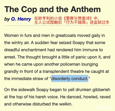 「行为不端罪」过于模糊和宽泛的特点让它出现在了在美国作家欧 · 亨利的作品里。在他家喻户晓的短篇讽刺小说《警察与赞美诗》中,穷困潦倒、无家可归的主人公流浪汉苏比为了被抓进监狱熬过严冬,就在大街上假装醉酒、胡乱喊叫、手舞足蹈,试图以此触犯「行为不端」的法规被判3个月监禁。