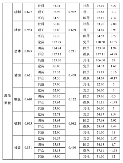 假设三检验。表4表明,实验对象在不同性别、年级、专业和政治面貌等属性之间,或者同一属性在不同实验组之间,都具有差异化的影响效果。不过,虽然存在直观的差异且在部分指标上差异明显,但全部未能构成统计学意义上的“显著性水平”(P<0.05)。故假设三不成立。
