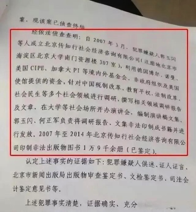 在郭玉闪非法经营案立案期间,经依法侦查查明:“自2007年3月起,郭玉闪成立北京传知行公司,利用德国博尔、诺曼、美国CIPE、加拿大PI等境内外基金会、非政府组织及美国使馆的资金支持,散播研究中国体制等非法文宣制书发送,犯罪事实清楚,证据确实充分,移送起诉。”