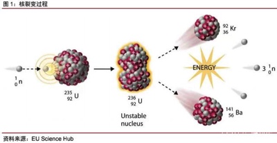 所谓核能,是原子核发生裂变或聚变反应时释放的能量。一颗原子核,直径只有一根头发丝的一亿分之一,但1kg原子核(铀-235)全部裂变释放出的能量,就相当于2700吨标准煤完全燃烧放出的能量。