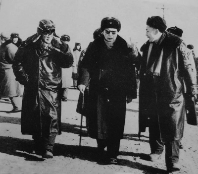 照片拍摄于1966年,在氢弹原理塔爆试验现场,王淦昌(左)与朱光亚(右)正向国务院副总理聂荣臻(中)汇报试验成果