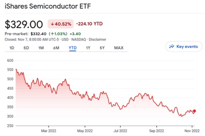 如果再往前推,全球半导体产业从今年一月开始,就一路往下滑。画面上是黑石公司(Black Rock)的iShares 半导体指数ETF。今年以来下跌了40.5%。全球整个半导体产业界都遇到需求下滑的情形。
